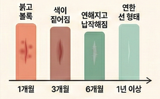 수술 직후 ~ 1개월, 형성기. 절개창이 닫히며 초기 흉터 조직이 만들어지는 시기입니다. 붉고 약간 볼록한 형태로 나타나며, 이때 자외선 차단과 청결 유지가 무엇보다 중요합니다.