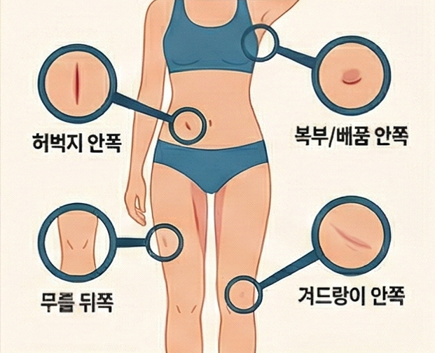 절개창의 크기는 보통 3~5mm. 일반 외과 수술과 비교하면 극히 작은 크기입니다. 노련한 집도의는 이 작은 흔적조차 최대한 눈에 띄지 않는 위치에 배치합니다. 자연스러운 피부 주름, 속옷 라인, 신체의 굴곡 속에 절개창을 숨기는 것은 수술 기술만큼이나 중요한 미적 판단입니다. 부위별로 살펴보면, 복부는 배꼽 안쪽이나 사타구니 주름 라인을 활용하고, 허벅지는 안쪽 또는 무릎 뒤 주름 부위에 절개창을 냅니다. 팔뚝의 경우 겨드랑이 안쪽이나 팔꿈치 주름을, 등과 옆구리는 속옷 라인 안쪽을 선택해 일상복을 입었을 때 흉터가 전혀 보이지 않도록 합니다. 한 부위당 절개창은 보통 2~4개 정도입니다.